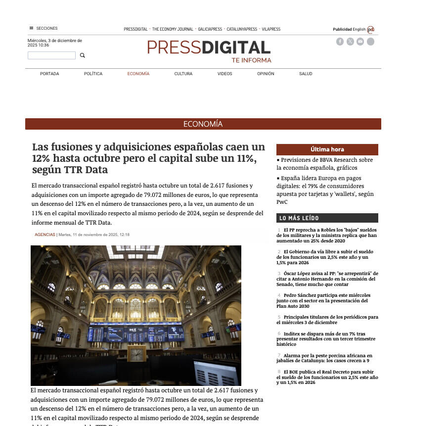 El mercado transaccional español registró hasta octubre un total de 2.617 fusiones y adquisiciones con un importe agregado de 79.072 millones de euros, lo que representa un descenso del 12% en el número de transacciones pero, a la vez, un aumento de un 11% en el capital movilizado respecto al mismo periodo de 2024, según se desprende del informe mensual de TTR Data.
