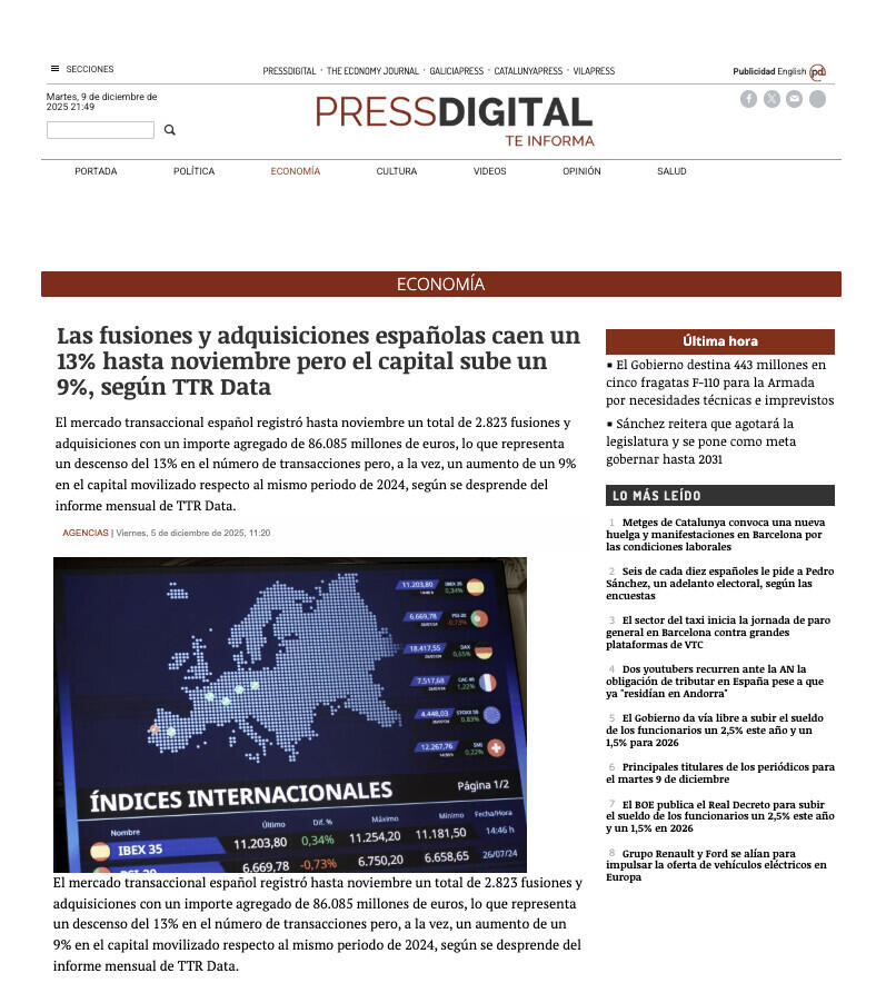 El mercado transaccional español registró hasta noviembre un total de 2.823 fusiones y adquisiciones con un importe agregado de 86.085 millones de euros, lo que representa un descenso del 13% en el número de transacciones pero, a la vez, un aumento de un 9% en el capital movilizado respecto al mismo periodo de 2024, según se desprende del informe mensual de TTR Data.