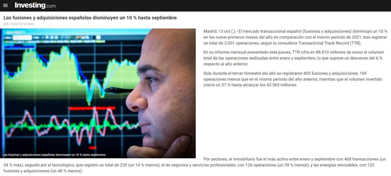 Madrid, 13 oct (.).- El mercado transaccional español (fusiones y adquisiciones) disminuyó un 10 % en los nueve primeros meses del año en comparación con el mismo periodo de 2021, tras registrar un total de 2.001 operaciones, según la consultora Transactional Track Record (TTR).