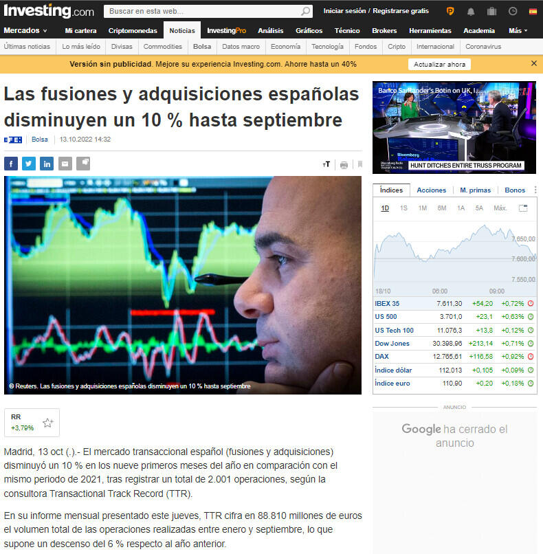 Madrid, 13 oct (.).- El mercado transaccional español (fusiones y adquisiciones) disminuyó un 10 % en los nueve primeros meses del año en comparación con el mismo periodo de 2021, tras registrar un total de 2.001 operaciones, según la consultora Transactional Track Record (TTR).