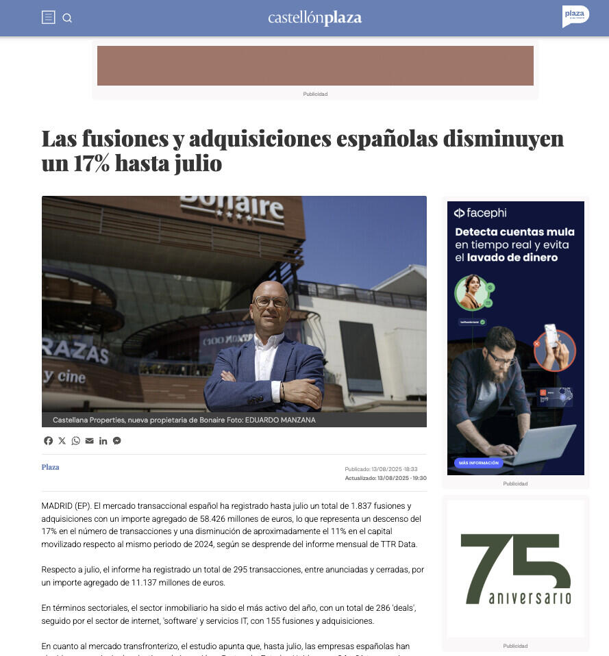 El mercado transaccional español ha registrado hasta julio un total de 1.837 fusiones y adquisiciones con un importe agregado de 58.426 millones de euros, lo que representa un descenso del 17% en el número de transacciones y una disminución de aproximadamente el 11% en el capital movilizado respecto al mismo periodo de 2024, según se desprende del informe mensual de TTR Data.