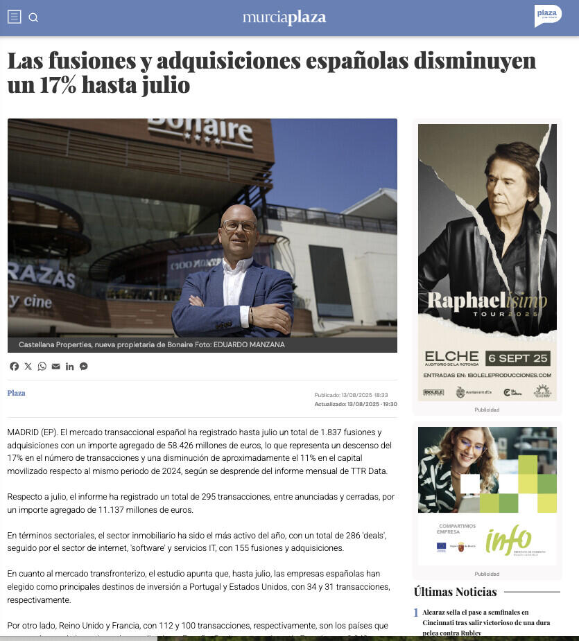 El mercado transaccional español ha registrado hasta julio un total de 1.837 fusiones y adquisiciones con un importe agregado de 58.426 millones de euros, lo que representa un descenso del 17% en el número de transacciones y una disminución de aproximadamente el 11% en el capital movilizado respecto al mismo periodo de 2024, según se desprende del informe mensual de TTR Data.