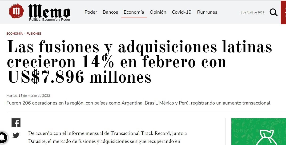 De acuerdo con el informe mensual de Transactional Track Record, junto a Datasite, el mercado de fusiones y adquisiciones se sigue recuperando en América Latina y el reporte de La República de Colombia, tras registrar un incremento de 14% en las transacciones de este tipo en la región.