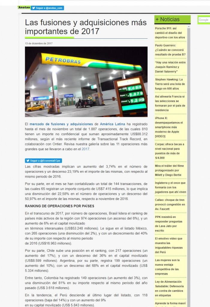 El mercado de fusiones y adquisiciones de América Latina ha registrado hasta el mes de noviembre un total de 1.887 operaciones, de las cuales 810 tienen un importe no confidencial que suman aproximadamente US$88.312 millones, según el más reciente informe de Transactional Track Record, en colaboración con Ontier. Revisa nuestra galería sobre las 11 operaciones más grandes que se llevaron a cabo en el 2017.