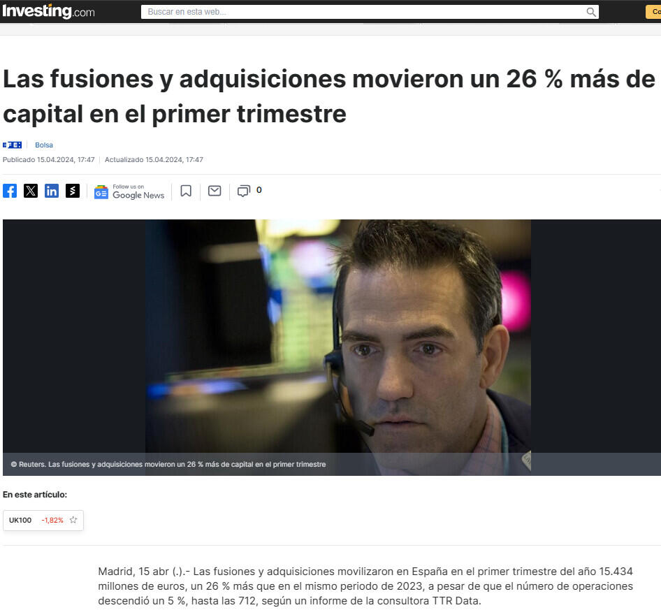 Madrid, 15 abr (.).- Las fusiones y adquisiciones movilizaron en España en el primer trimestre del año 15.434 millones de euros, un 26 % más que en el mismo periodo de 2023, a pesar de que el número de operaciones descendió un 5 %, hasta las 712, según un informe de la consultora TTR Data.
