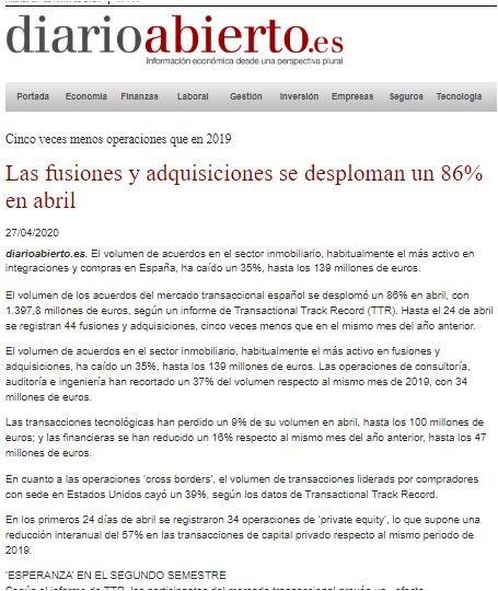 El volumen de los acuerdos del mercado transaccional español se desplomó un 86% en abril, con 1.397,8 millones de euros, según un informe de Transactional Track Record (TTR). Hasta el 24 de abril se registran 44 fusiones y adquisiciones, cinco veces menos que en el mismo mes del año anterior.