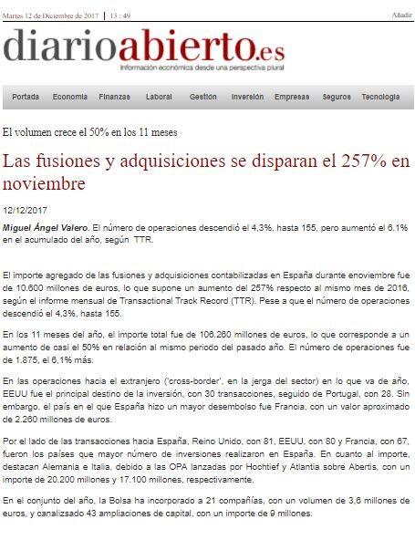 El importe agregado de las fusiones y adquisiciones contabilizadas en España durante enoviembre fue de 10.600 millones de euros, lo que supone un aumento del 257% respecto al mismo mes de 2016, según el informe mensual de Transactional Track Record (TTR). Pese a que el número de operaciones descendió el 4,3%, hasta 155.