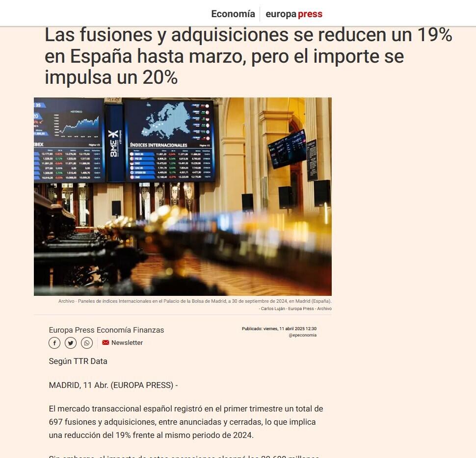 El mercado transaccional español registró en el primer trimestre un total de 697 fusiones y adquisiciones, entre anunciadas y cerradas, lo que implica una reducción del 19% frente al mismo periodo de 2024.