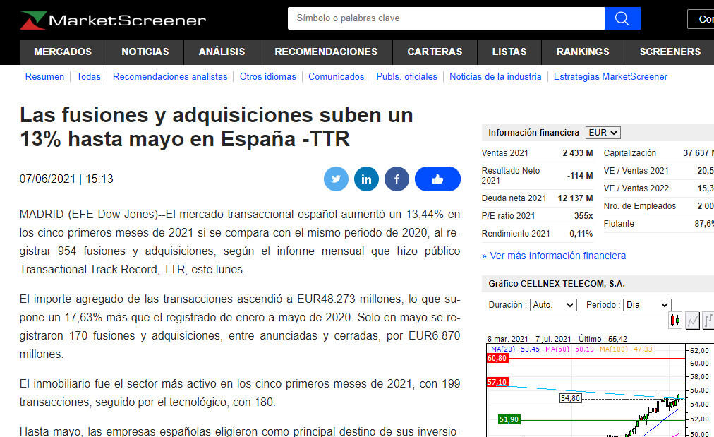 El mercado transaccional español aumentó un 13,44% en los cinco primeros meses de 2021 si se compara con el mismo periodo de 2020, al registrar 954 fusiones y adquisiciones, según el informe mensual que hizo público Transactional Track Record, TTR, este lunes.
