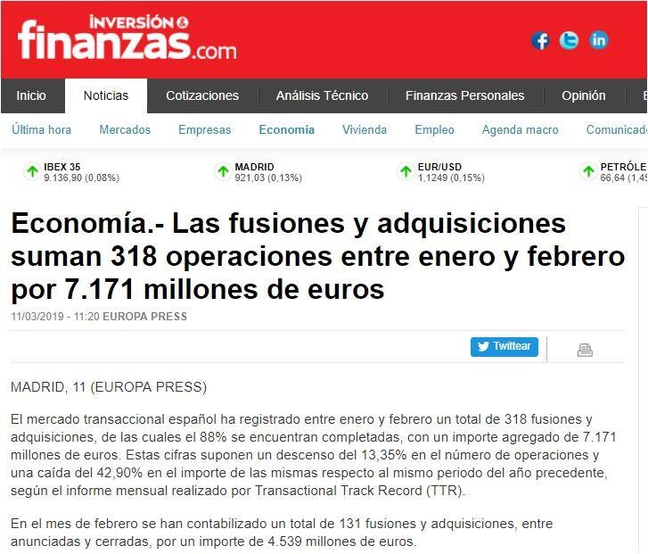 En febrero de 2019, TTR ha seleccionado como transacción destacada la adquisición de Antares a Telefónica por parte del Grupo Catalana Occidente, por un importe de 161 millones de euros.