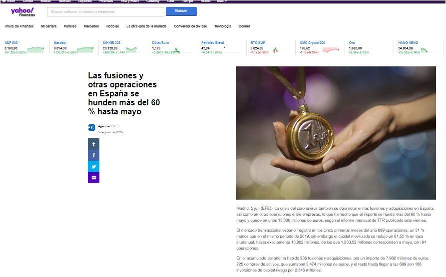 La crisis del coronavirus también se deja notar en las fusiones y adquisiciones en España, así como en otras operaciones entre empresas, lo que ha hecho que el importe se hunda más del 60 % hasta mayo y quede en unos 13.800 millones de euros, según el informe mensual de TTR publicado este viernes.