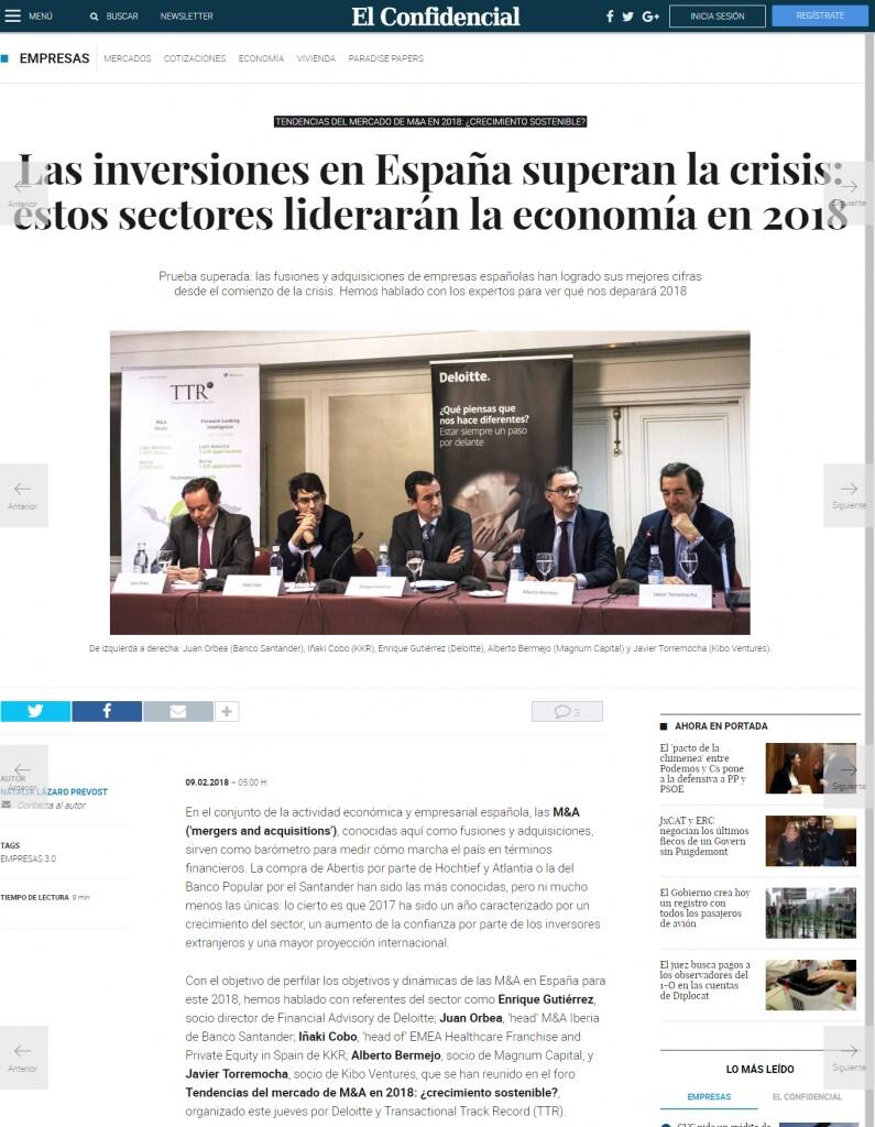 Con el objetivo de perfilar los objetivos y dinámicas de las M&A en España para este 2018, hemos hablado con referentes del sector como Enrique Gutiérrez, socio director de Financial Advisory de Deloitte; Juan Orbea, 'head' M&A Iberia de Banco Santander; Iñaki Cobo, 'head of' EMEA Healthcare Franchise and Private Equity in Spain de KKR; Alberto Bermejo, socio de Magnum Capital, y Javier Torremocha, socio de Kibo Ventures, que se han reunido en el foro Tendencias del mercado de M&A en 2018: ¿crecimiento sostenible?, organizado este jueves por Deloitte y Transactional Track Record (TTR).
