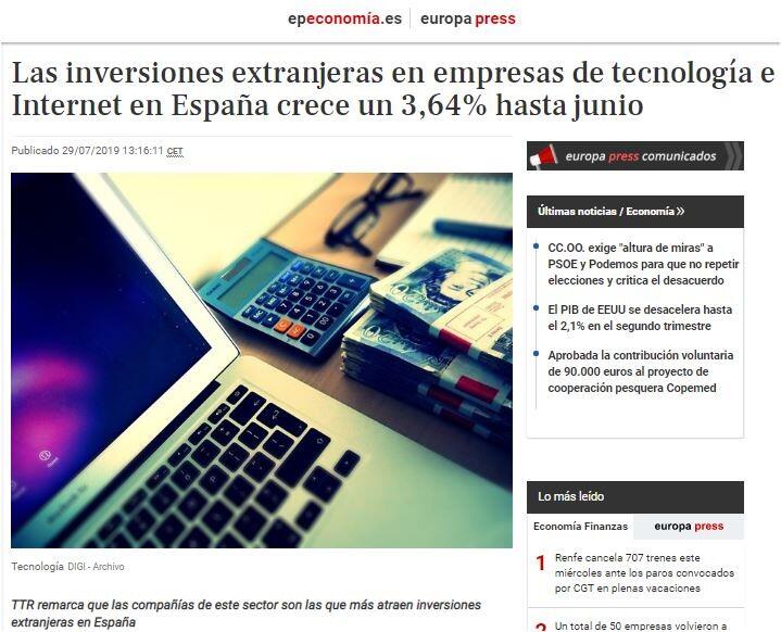 Las inversiones extranjeras en empresas de tecnología e Internet en España crece un 3,64% hasta junio