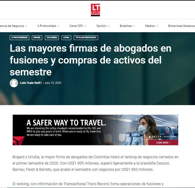 Brigard y Urrutia, la mayor firma de abogados de Colombia lideró el ranking de negocios cerrados en el primer semestre de 2020. Con US$1.909 millones, superó ligeramente a la brasileña Cescon, Barrieu, Flesh & Barreto, que acabó el semestre con negocios por US$1.905 millones.