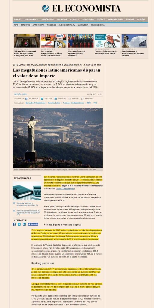 Las fusiones y adquisiciones en América Latina alcanzaron las 509 operaciones al segundo trimestre del 2017, de las cuales 218 tienen un importe no confidencial que suman aproximadamente 33,016 millones de dólares, según el más reciente informe de Transactional Track Record (www.TTRecord.com).