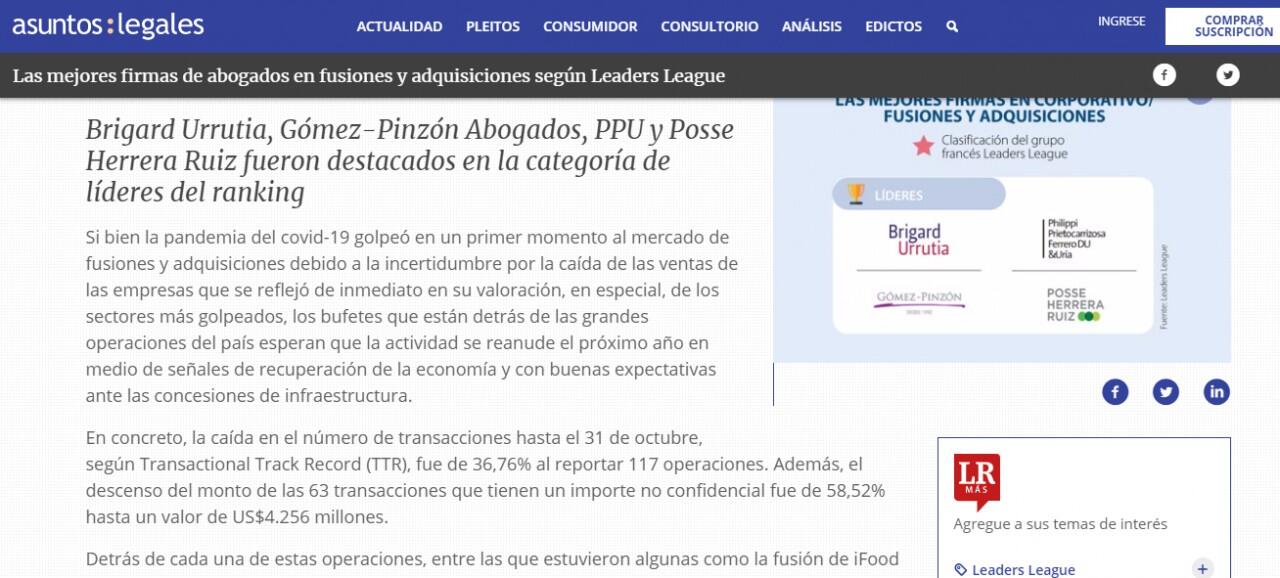 Por su parte, Herrera manifestó que recibe este reconocimiento con orgullo no solo por los seis socios y más de 30 abogados del grupo de fusiones y adquisiciones sino por las áreas de práctica en laboral, impuestos, compliance, competencia, financiero, inmobiliario u propiedad intelectual, entre otras, que “forman un solo equipo y han sido fundamentales para asistir a nuestros clientes en las más importantes y complejas transacciones”.