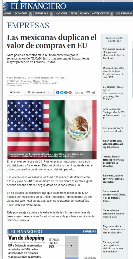 “Hemos visto que en los últimos meses hay mayor interés por comprar en Estados Unidos; la inminente renegociación del TLCAN obliga a las compañías a revisar su estrategia y parte de esto es tener un pie allá.