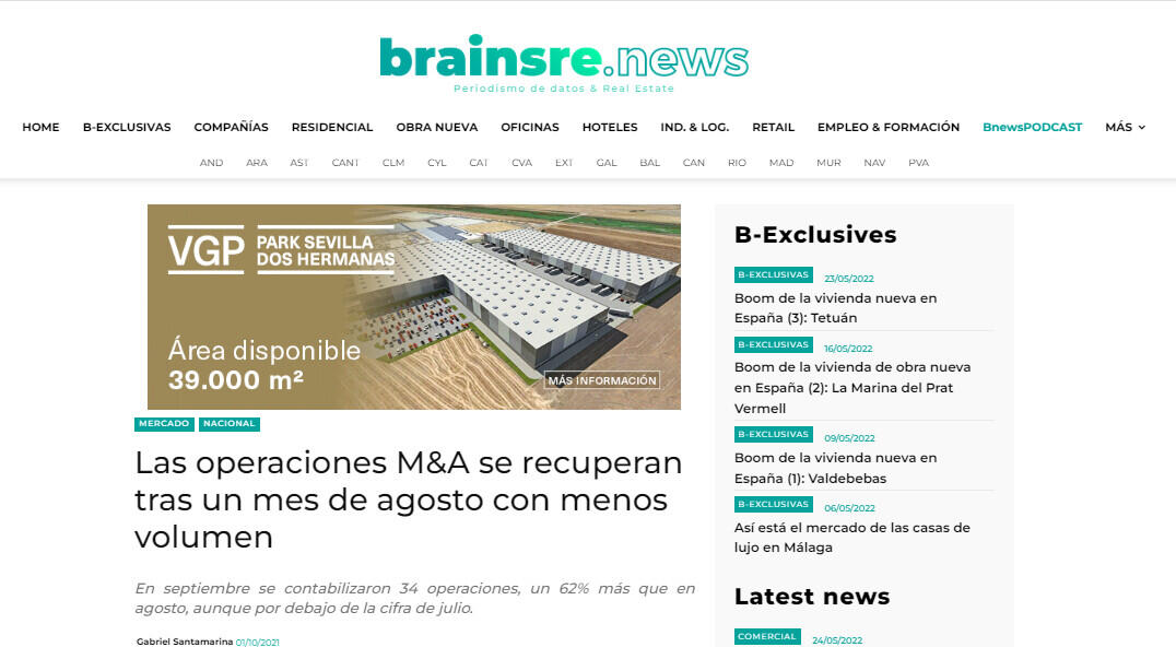 Septiembre retoma la actividad transaccional después del verano. Según un informe de Transactional Track Record, en el noveno mes del año, se contabilizaron 34 operaciones de fusiones y adquisiciones en el sector inmobiliario español. El importe total de las operaciones fueron 587,15 millones de euros.