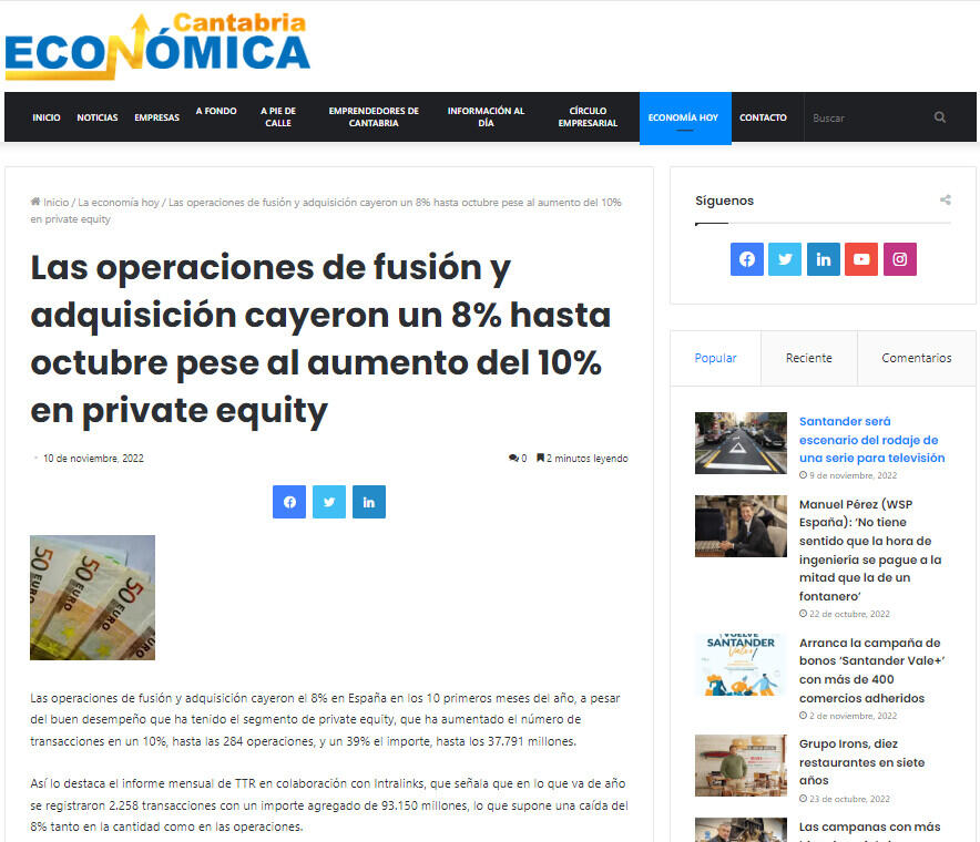 The post Las operaciones de fusión y adquisición cayeron un 8% hasta octubre pese al aumento del 10% en private equity first appeared on Crónica de Cantabria.