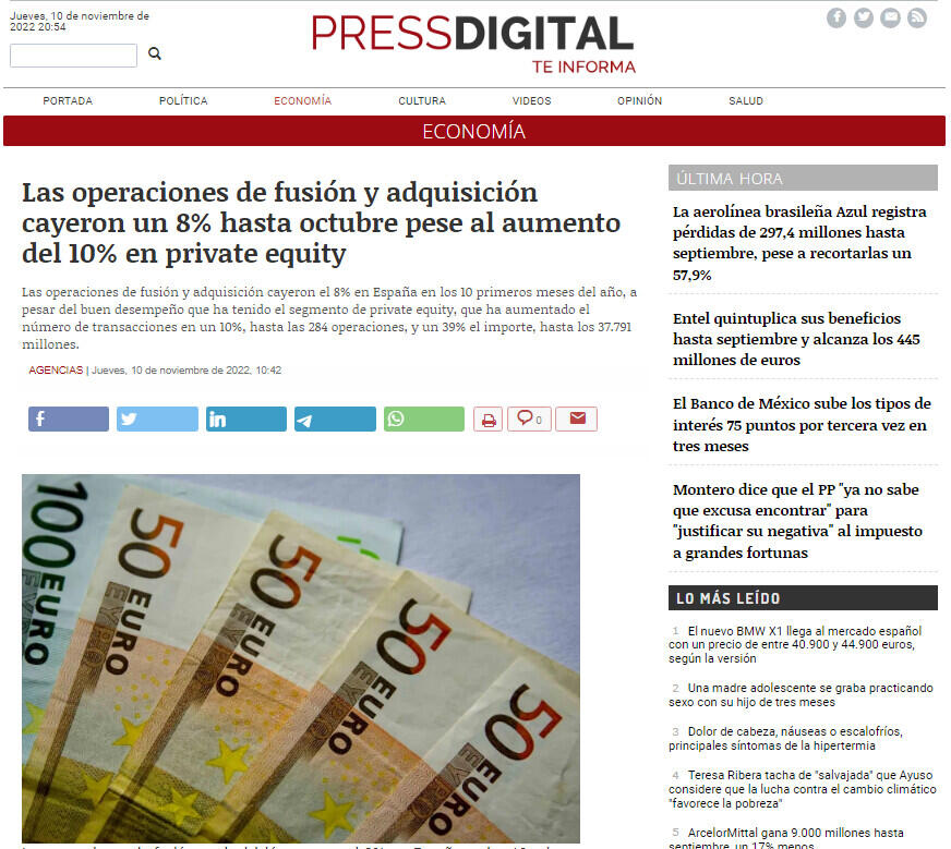 Por lo que respecta al mercado transfronterizo, hasta octubre de 2022 las empresas españolas eligieron como principal destino de inversión a Estados Unidos, con 43 transacciones. Por otro lado, Estados Unidos y Reino Unido son los países que mayor número de inversiones han realizado en España, con 171 y 147 operaciones, respectivamente.