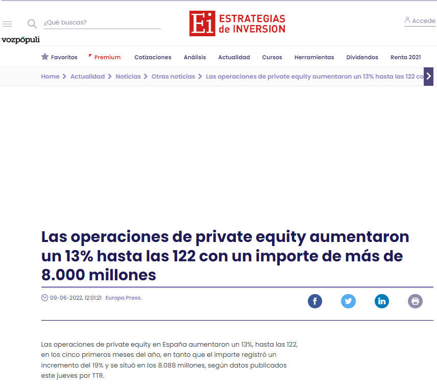 Las operaciones de private equity en España aumentaron un 13%, hasta las 122, en los cinco primeros meses del año, en tanto que el importe registró un incremento del 19% y se situó en los 8.088 millones, según datos publicados este jueves por TTR.