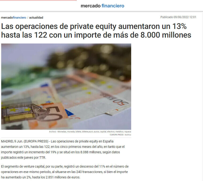 Las operaciones de private equity en España aumentaron un 13%, hasta las 122, en los cinco primeros meses del año, en tanto que el importe registró un incremento del 19% y se situó en los 8.088 millones, según datos publicados este jueves por TTR.