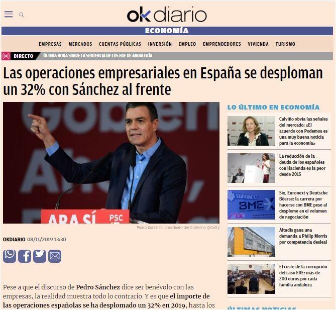 Pese a que el discurso de Pedro Sánchez dice ser benévolo con las empresas, la realidad muestra todo lo contrario. Y es que el importe de las operaciones españolas se ha desplomado un 32% en 2019, hasta los 62.960 millones de euros.