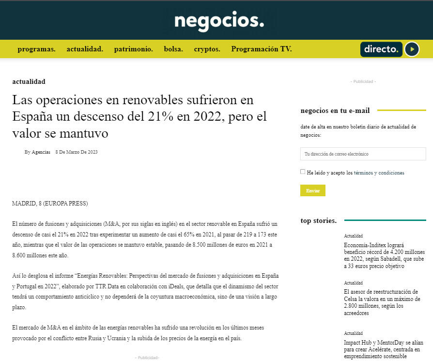 Así lo desglosa el informe “Energías Renovables: Perspectivas del mercado de fusiones y adquisiciones en España y Portugal en 2022”, elaborado por TTR Data en colaboración con iDeals, que detalla que el dinamismo del sector tendrá un comportamiento anticíclico y no dependerá de la coyuntura macroeconómica, sino de una visión a largo plazo.