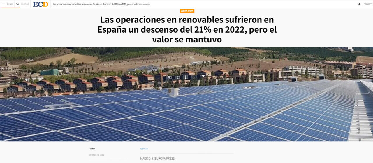 Las operaciones en renovables sufrieron en Espaņa un descenso del 21% en 2022, pero el valor se mantuvo