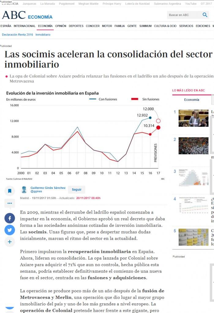 En caso de cerrarse, la operación entre Axiare y Colonial reflejaría la llegada definitiva de la consolidación a un sector que, pese a mantener una recuperación relativamente sólida, todavía se encuentra excesivamente atomizado. En la actualidad, el Mercado Alternativo Bursátil (MAB) cuenta con cuarenta y dos socimis. «Es la consecuencia lógica de un mercado en expansión, gracias a, entre otros factores, el crecimiento de la economía nacional, la mejora del empleo y unas favorables condiciones de financiación», sostiene Adolfo Ramírez Escudero, presidente de CBRE España.
