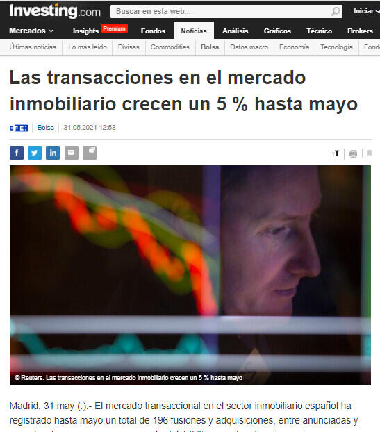 El mercado transaccional en el sector inmobiliario español ha registrado hasta mayo un total de 196 fusiones y adquisiciones, entre anunciadas y cerradas, lo que supone un aumento del 4,8 % respecto a los cinco primeros meses de 2020, por un importe agregado de 4.351 millones de euros, un 46,3 % más.