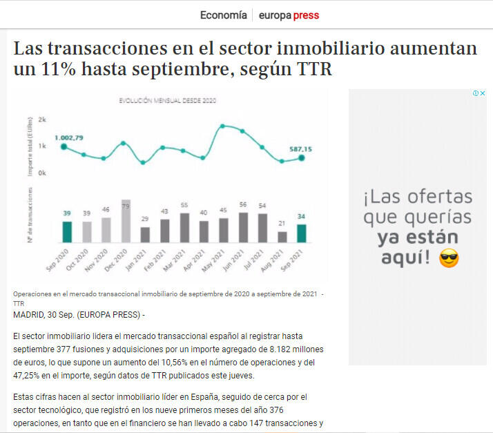 El volumen de fusiones y adquisiciones en el sector inmobiliario español creció cerca de un 11% hasta septiembre en comparación con el mismo periodo de 2020, tras registrar un total de 377 operaciones, según la consultora Transactional Track Record (TTR).