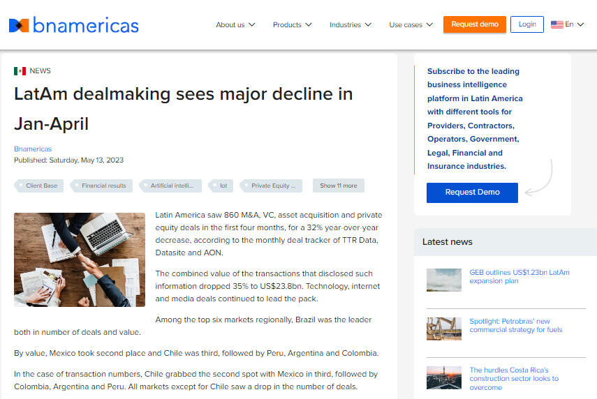 Latin America saw 860 M&A, VC, asset acquisition and private equity deals in the first four months, for a 32% year-over-year decrease, according to the monthly deal tracker of TTR Data, Datasite and AON.