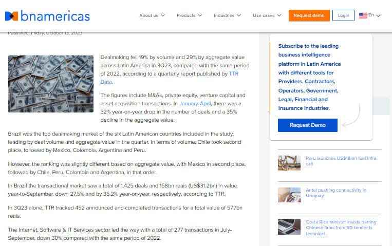 Dealmaking fell 19% by volume and 29% by aggregate value across Latin America in 3Q23, compared with the same period of 2022, according to a quarterly report published by TTR Data.