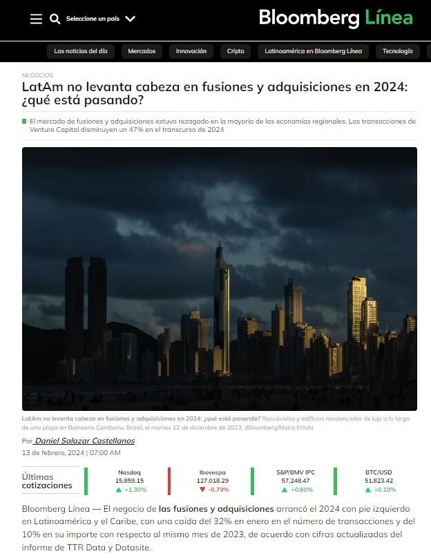 “América Latina ha venido experimentando un nivel de incertidumbre en el mercado en los últimos períodos. El mercado transaccional ha estado marcado por un contexto económico complejo, sobre todo en los últimos dos trimestres de 2023 y en lo que vamos de 2024, lo que ha influido de manera significativa, tanto en la tipología de transacciones, como en la duración de los procesos de M&A”, dijo a Bloomberg Línea la vocera institucional de TTR, Marcela Chacón Sierra.