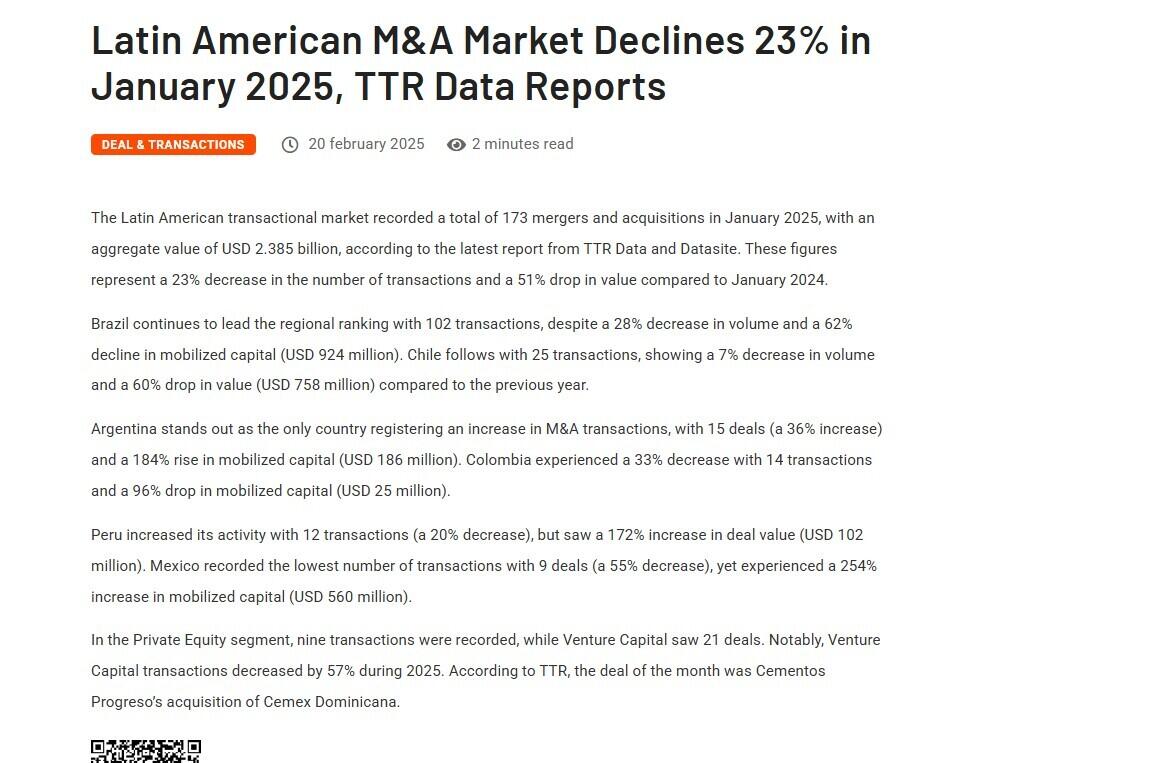 Latin American M&A Market Declines 23% in January 2025, TTR Data Reports