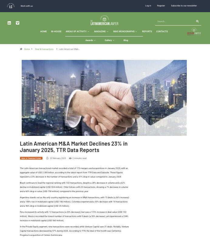 Latin American M&A Market Declines 23% in January 2025, TTR Data Reports
