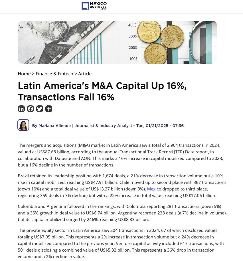 The mergers and acquisitions (M&A) market in Latin America saw a total of 2,904 transactions in 2024, valued at US$87.68 billion, according to the annual Transactional Track Record (TTR) Data report, in collaboration with Datasite and AON. This marks a 16% increase in capital mobilized compared to 2023, but a 16% decline in the number of transactions.