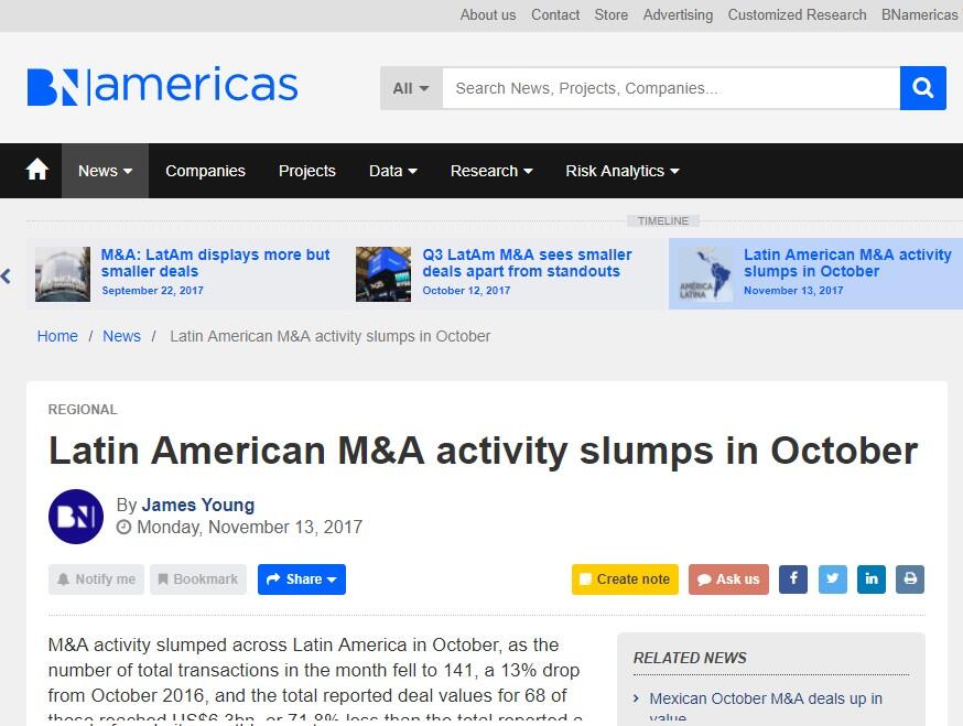 M&A activity slumped across Latin America in October, as the number of total transactions in the month fell to 141, a 13% drop from October 2016, and the total reported deal values for 68 of those reached US$6.3bn, or 71.8% less than the total reported a year before.
