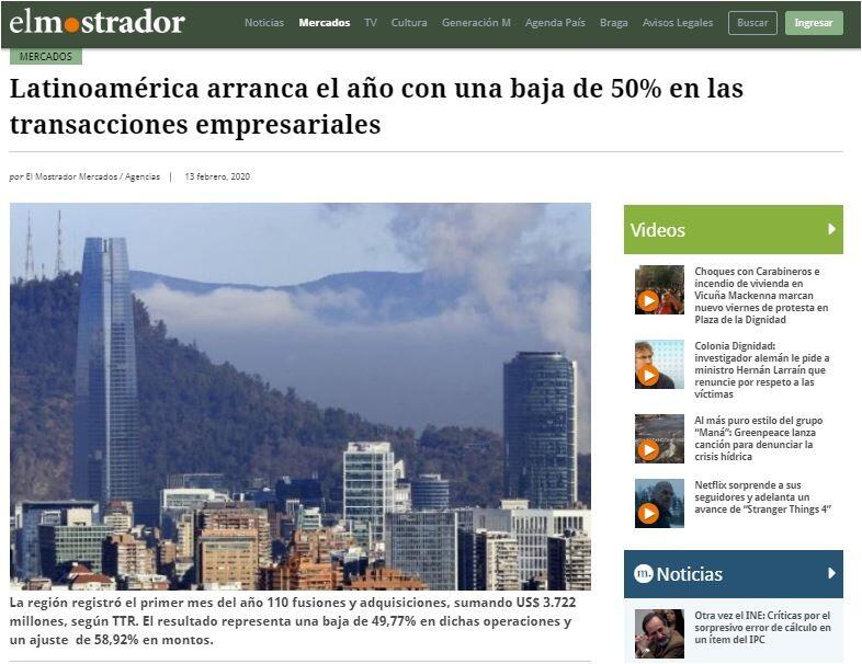 De acuerdo al informe del primer mes del año (Transactional Track Record, TTR), el mercado de fusiones y adquisiciones en América Latina ha concluido el primer mes de 2020 con una disminución en el número de transacciones registradas y en el capital movilizado, en comparación con el mismo periodo de 2019.
