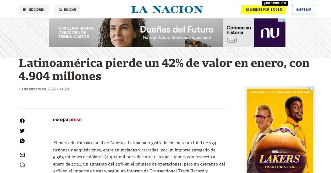 El mercado transaccional de América Latina ha registrado en enero un total de 234 fusiones y adquisiciones, entre anunciadas y cerradas, por un importe agregado de 5.565 millones de dólares (4.904 millones de euros), lo que supone, con respecto a enero de 2021, un aumento del 22% en el número de operaciones, pero un descenso del 42% en el importe de estas, según un informe de Transactional Track Record y Datasite.