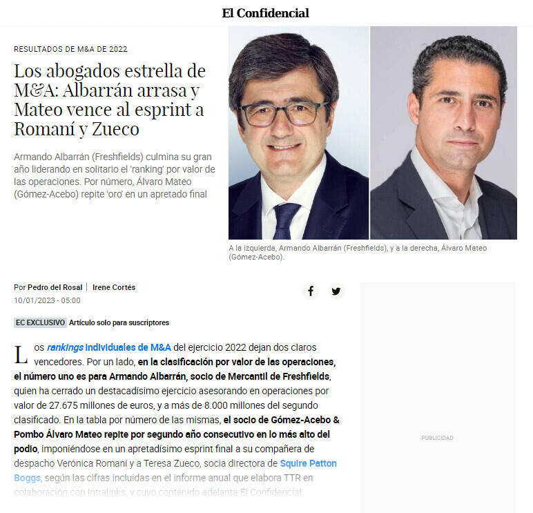 Los rankings individuales de M&A del ejercicio 2022 dejan dos claros vencedores. Por un lado, en la clasificación por valor de las operaciones, el número uno es para Armando Albarrán, socio de Mercantil de Freshfields, quien ha cerrado un destacadísimo ejercicio asesorando en operaciones por valor de 27.675 millones de euros, y a más de 8.000 millones del segundo clasificado. En la tabla por número de las mismas, el socio de Gómez-Acebo & Pombo Álvaro Mateo repite por segundo año consecutivo en lo más alto del podio, imponiéndose en un apretadísimo esprint final a su compañera de despacho Verónica Romaní y a Teresa Zueco, socia directora de Squire Patton Boggs, según las cifras incluidas en el informe anual que elabora TTR en colaboración con Intralinks, y cuyo contenido adelanta El Confidencial.