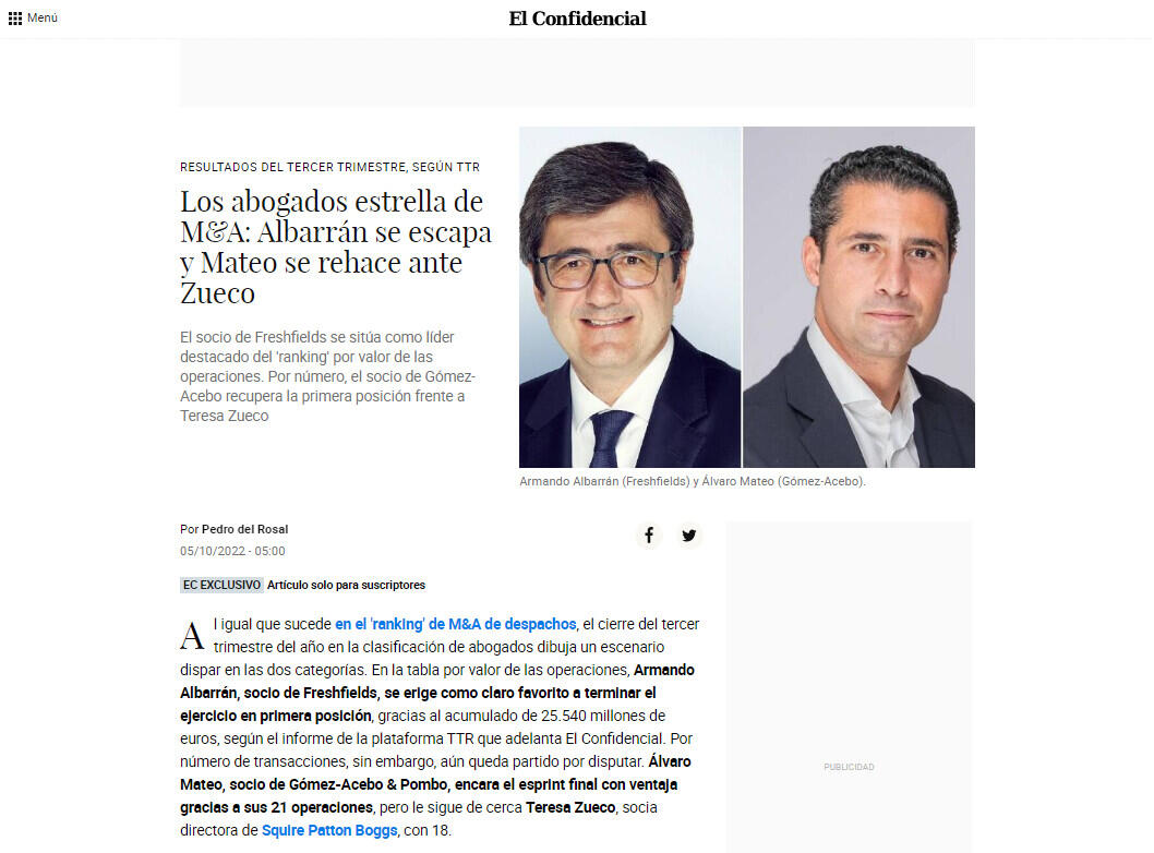 El socio de Freshfields se sitúa como líder destacado del 'ranking' por valor de las operaciones. Por número, el socio de Gómez-Acebo recupera la primera posición frente a Teresa Zueco