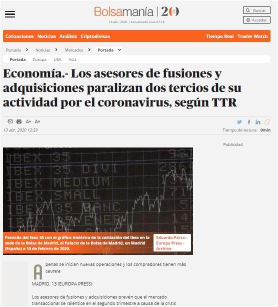 Los asesores de fusiones y adquisiciones paralizan dos tercios de su actividad por el coronavirus, según TTR