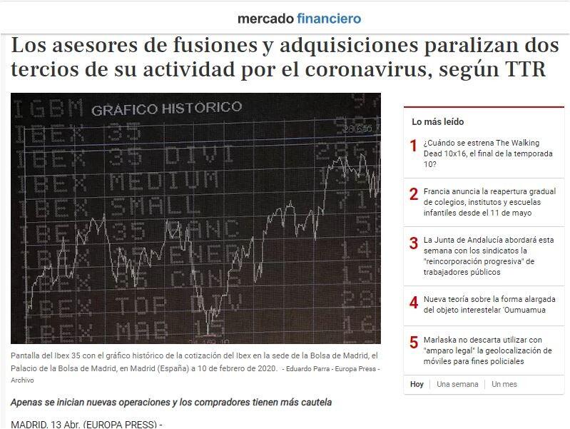 Los asesores de fusiones y adquisiciones paralizan dos tercios de su actividad por el coronavirus, según TTR