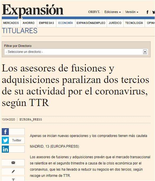 Los asesores de fusiones y adquisiciones paralizan dos tercios de su actividad por el coronavirus, según TTR