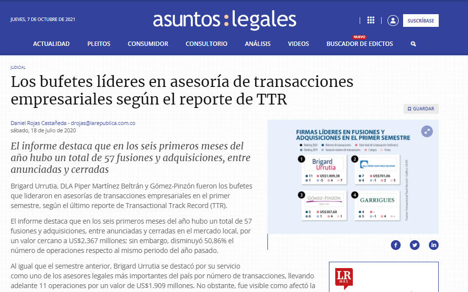 Brigard Urrutia, DLA Piper Martínez Beltrán y Gómez-Pinzón fueron los bufetes que lideraron en asesorías de transacciones empresariales en el primer semestre, según el último reporte de Transactional Track Record (TTR).
