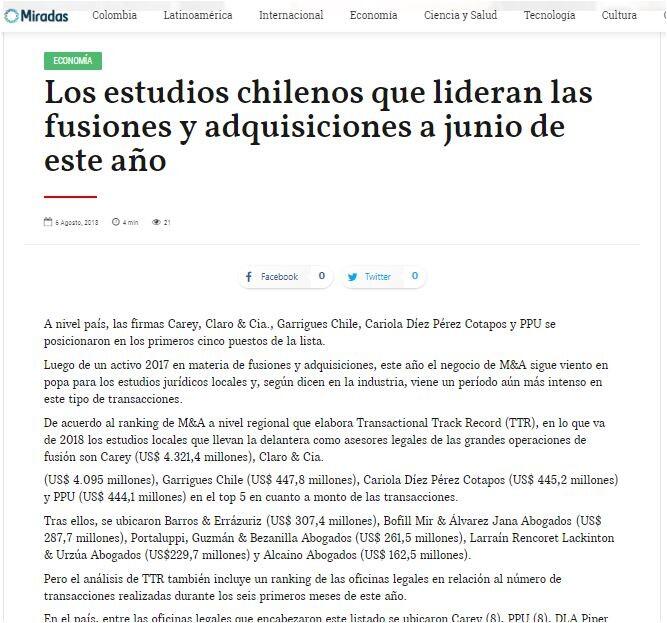 (US$ 4.095 millones), Garrigues Chile (US$ 447,8 millones), Cariola Díez Pérez Cotapos (US$ 445,2 millones) y PPU (US$ 444,1 millones) en el top 5 en cuanto a monto de las transacciones.