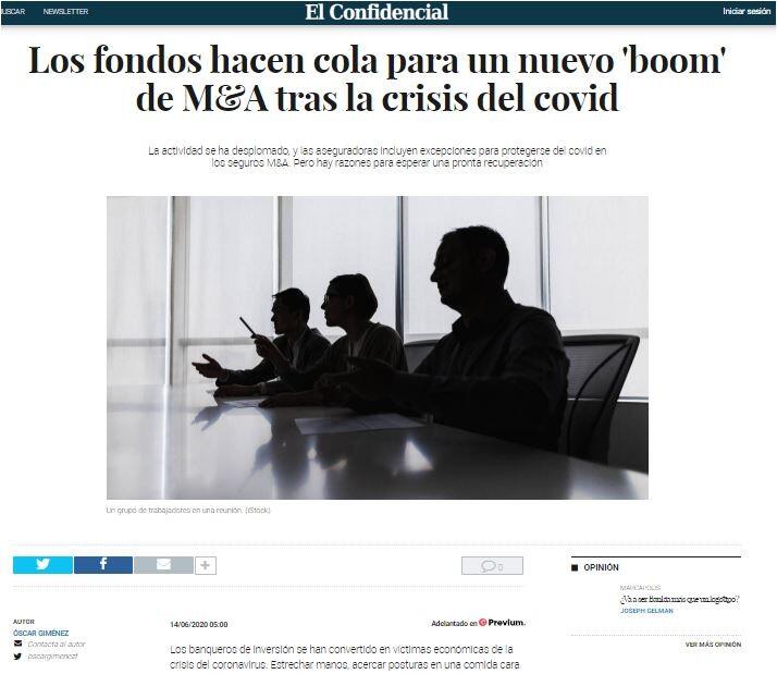 "Al igual que con muchas partes de la economía global, la actividad de fusiones y adquisiciones ha experimentado un cambio importante. A medida que las empresas centran su atención en la amenaza inmediata y la necesidad de recuperación, algunos acuerdos se cancelan, mientras que otros se presentan", expone el informe de EthosData, empresa proveedora de servicios de 'data room' virtual. Sin embargo, añade, "estamos viendo una ola de nuevos acuerdos como resultado de la crisis actual, ya que algunas compañías se apresuran a reestructurarse y encontrar liquidez".