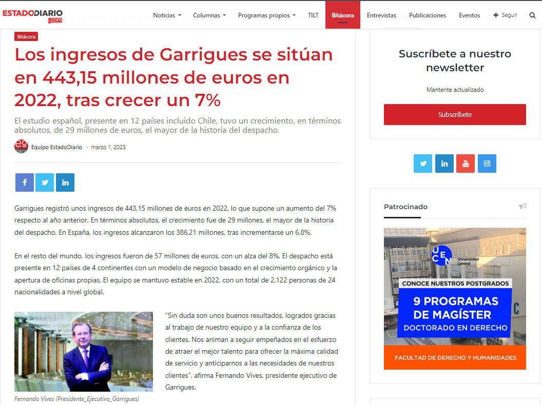 “Sin duda son unos buenos resultados, logrados gracias al trabajo de nuestro equipo y a la confianza de los clientes. Nos animan a seguir empeñados en el esfuerzo de atraer el mejor talento para ofrecer la máxima calidad de servicio y anticiparnos a las necesidades de nuestros clientes”, afirma Fernando Vives, presidente ejecutivo de Garrigues.